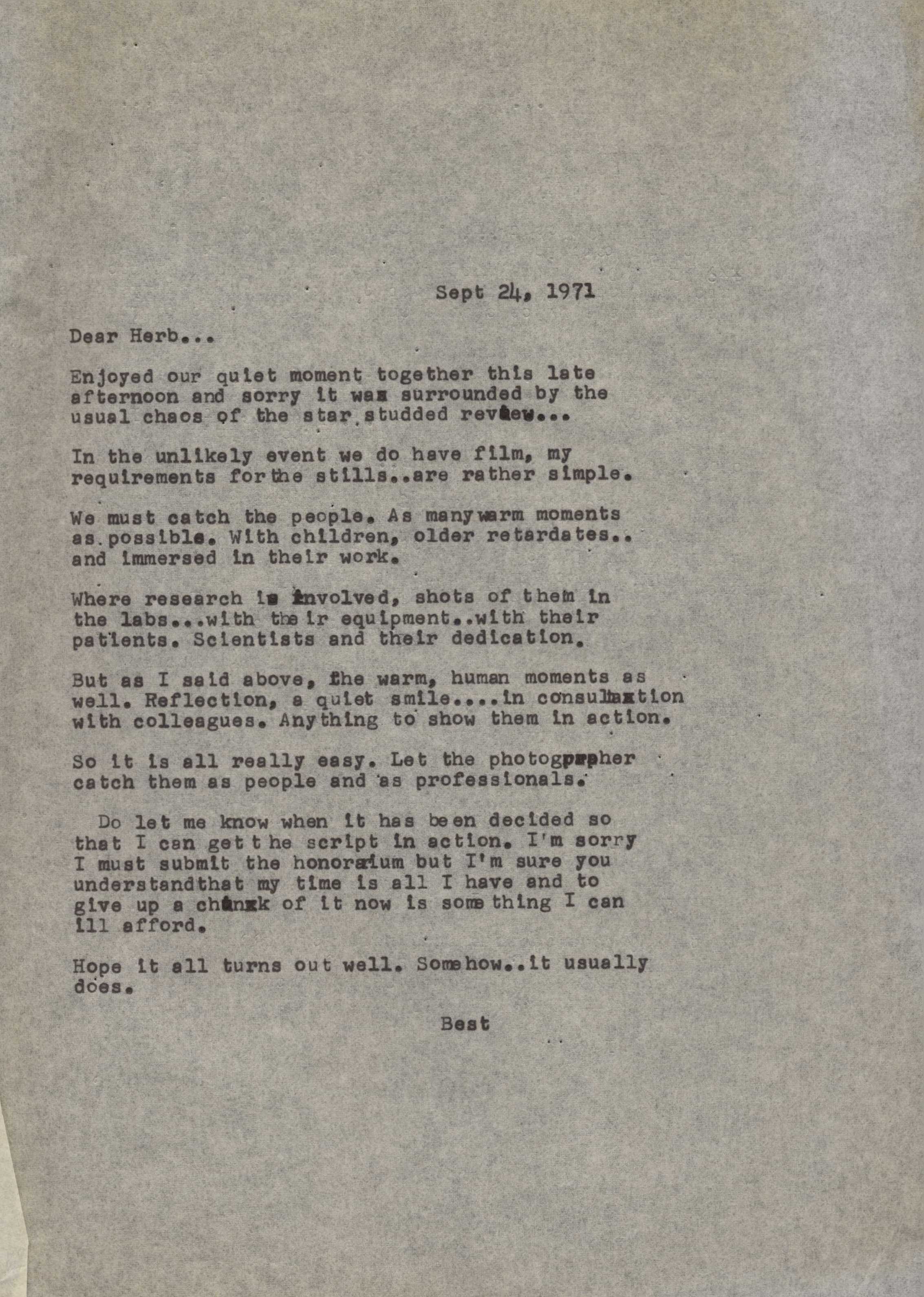 - Letter from Boretz to Herb about filming mentally disabled patients for a story.