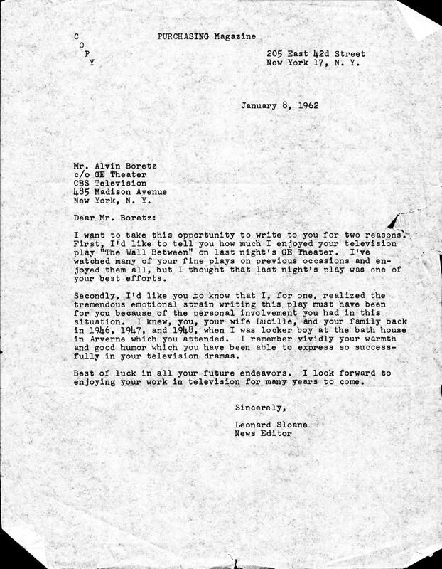 Letter from Leonard Sloane from Purchase Magazine on "The Wall Between"
