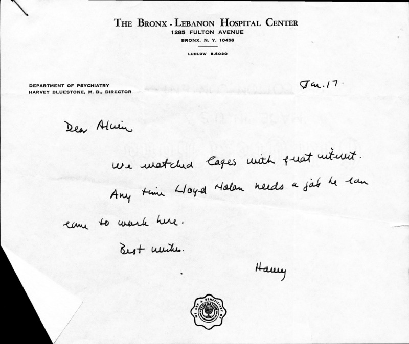 Letters from Bronx Lebanon Hospital Center on "The Cage"