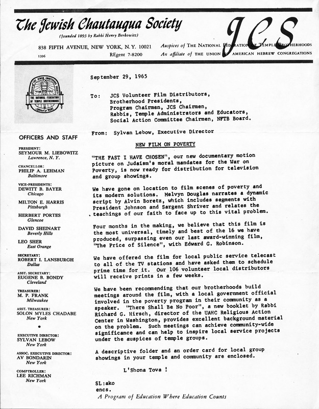 Letter from the Jewish Chautauqua Society about "The Fast I Have Chosen"