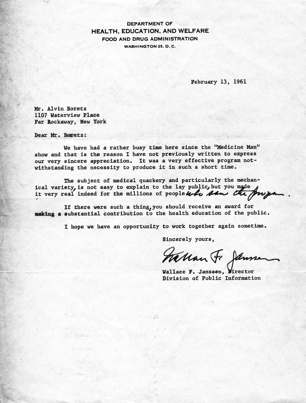 Letter from Dept of Public Health to Boretz Praising "Medicine Man"