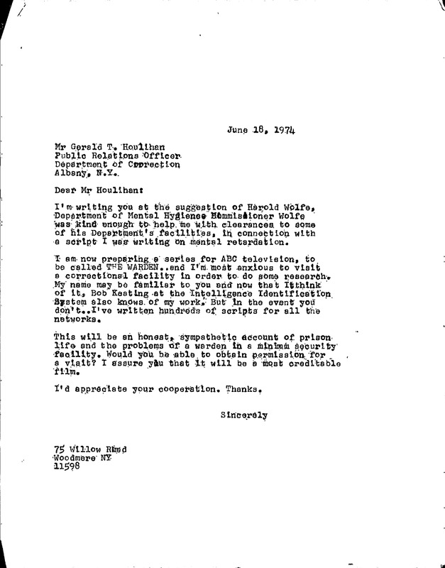 Letter from Boretz to Houlihen for research on "The Warden"