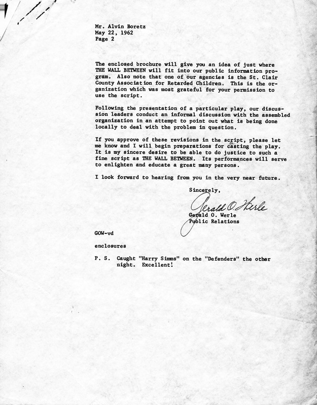Letter on "The Wall Between" Play Production