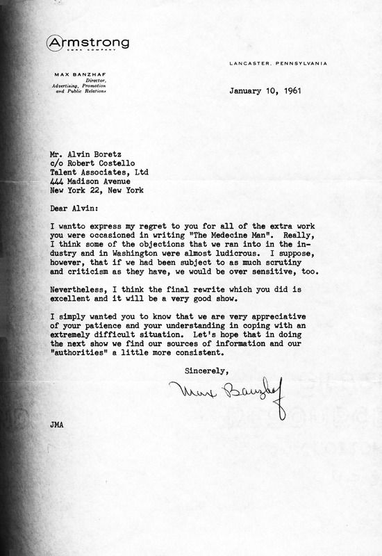 Letter on "Medicine Man" (Armstrong Circle Theater)