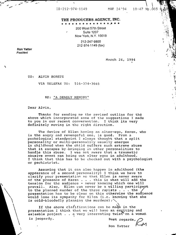 Letter Discussing "A Deadly Memory" Script Changes
