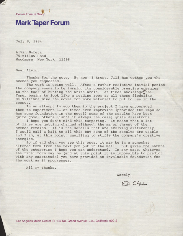 Letter from Ed Call at Mark Taper Forum Theater