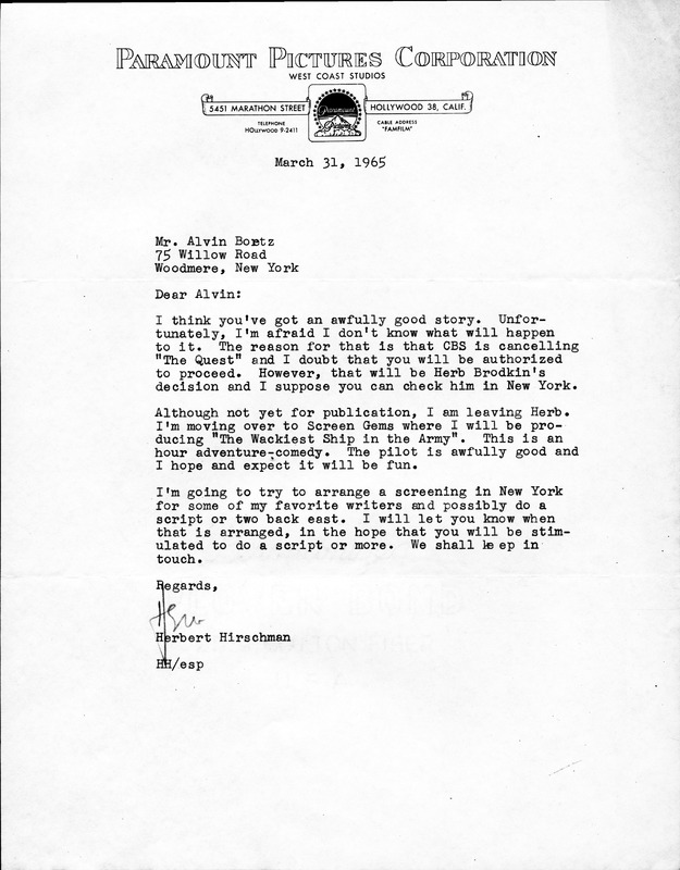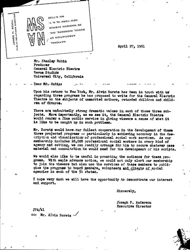 Letter from General Electric Theater about Boretz's writings