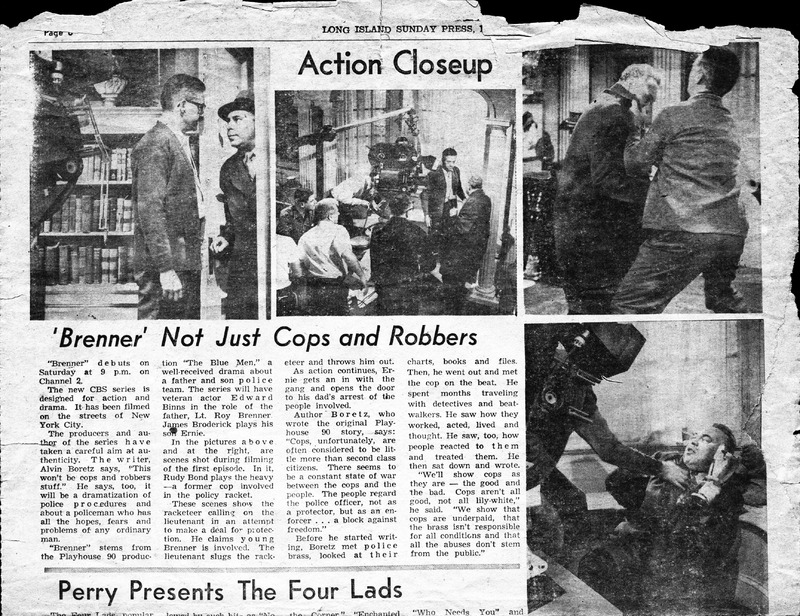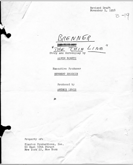 The original concept for Brenner began with Boretz's episode for the anthology drama series Playhouse 90, called "The Blue Men." The episode was critically lauded for its narrative and characterization, leading Boretz to rework the story and script into a new screenplay titled "Brenner" with the first episode called "The Thin Line." The series follows the Brenner family, a father-and-son duo working at the NYPD, as they fight and solve crime together. Brenner ran for two seasons, but even though the basis for the series began with Boretz's original script for Playhouse 90, his name does not appear in credits for the series creation. Boretz contributed numerous scripts to the series until its run ended in 1961. Boretz's early career in television reflects how the dominant medium of television worked to create popular series that were often tightly formatted but beginning to break the boundaries of narrative structure and subject matters previously established by radio.