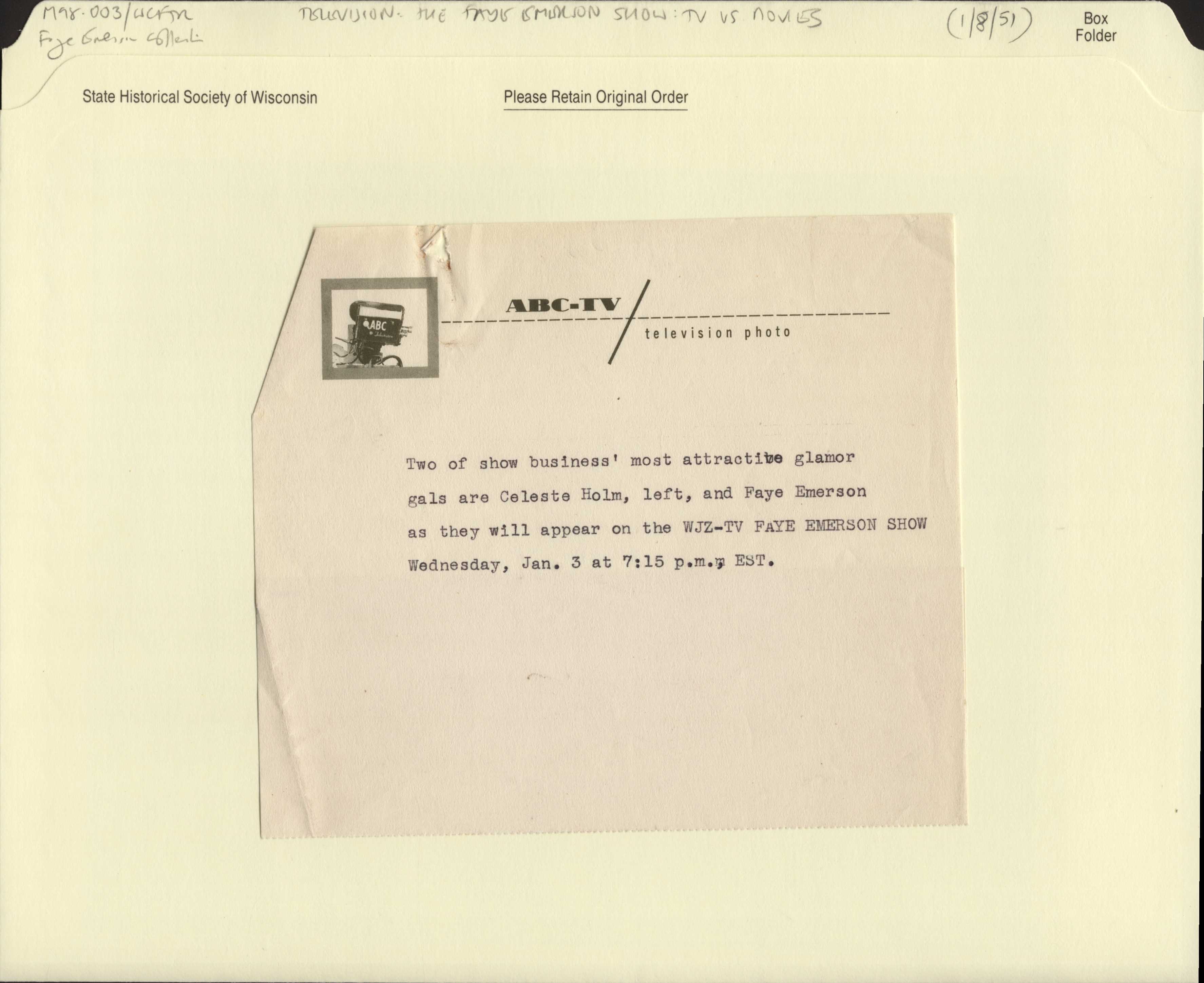 - WCFTR - Faye Emerson Collection - 1798-003, "Television: The Faye Emerson Show: United Nations"