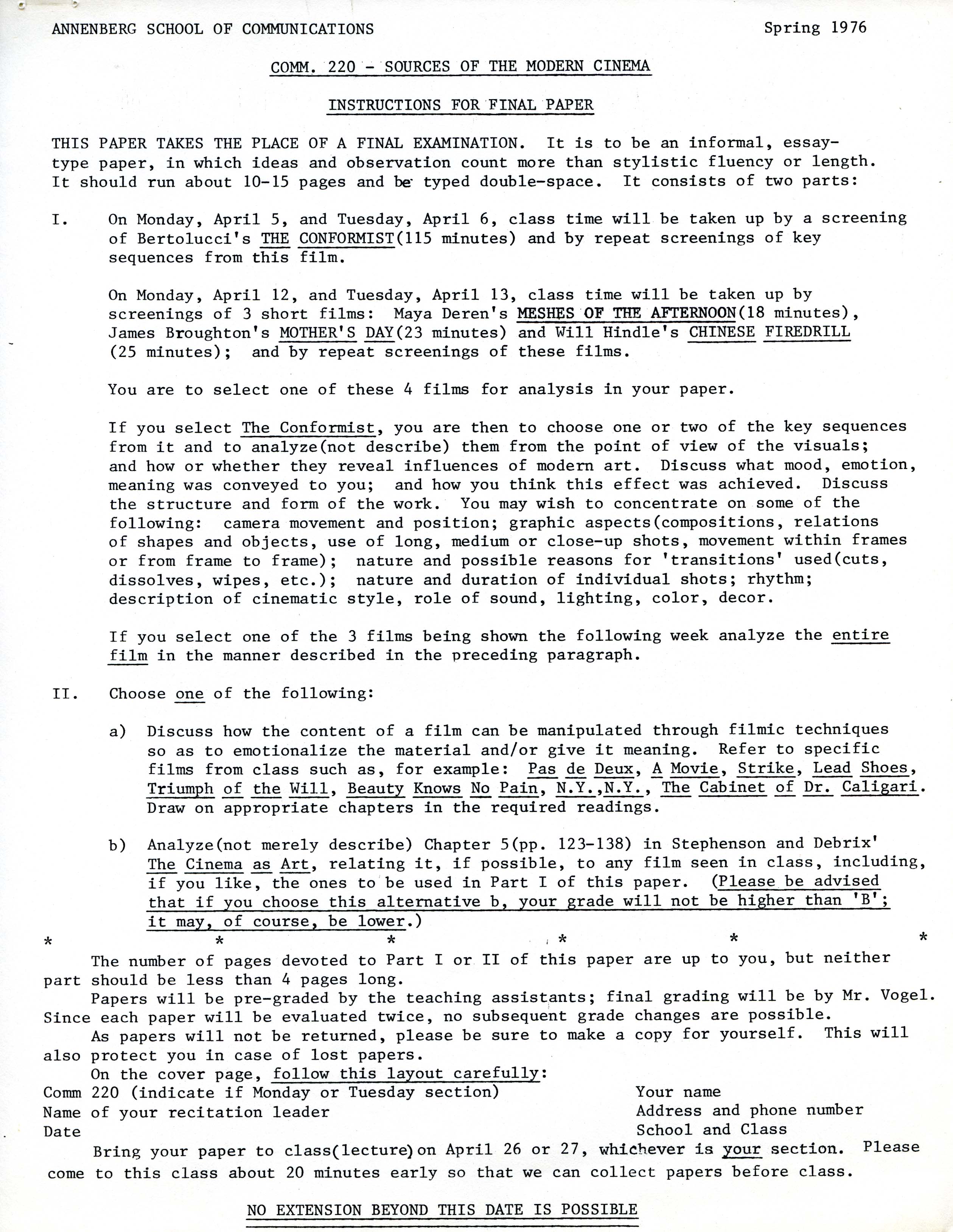 Source of the Modern Cinema, final paper instructions (Spring 1976)