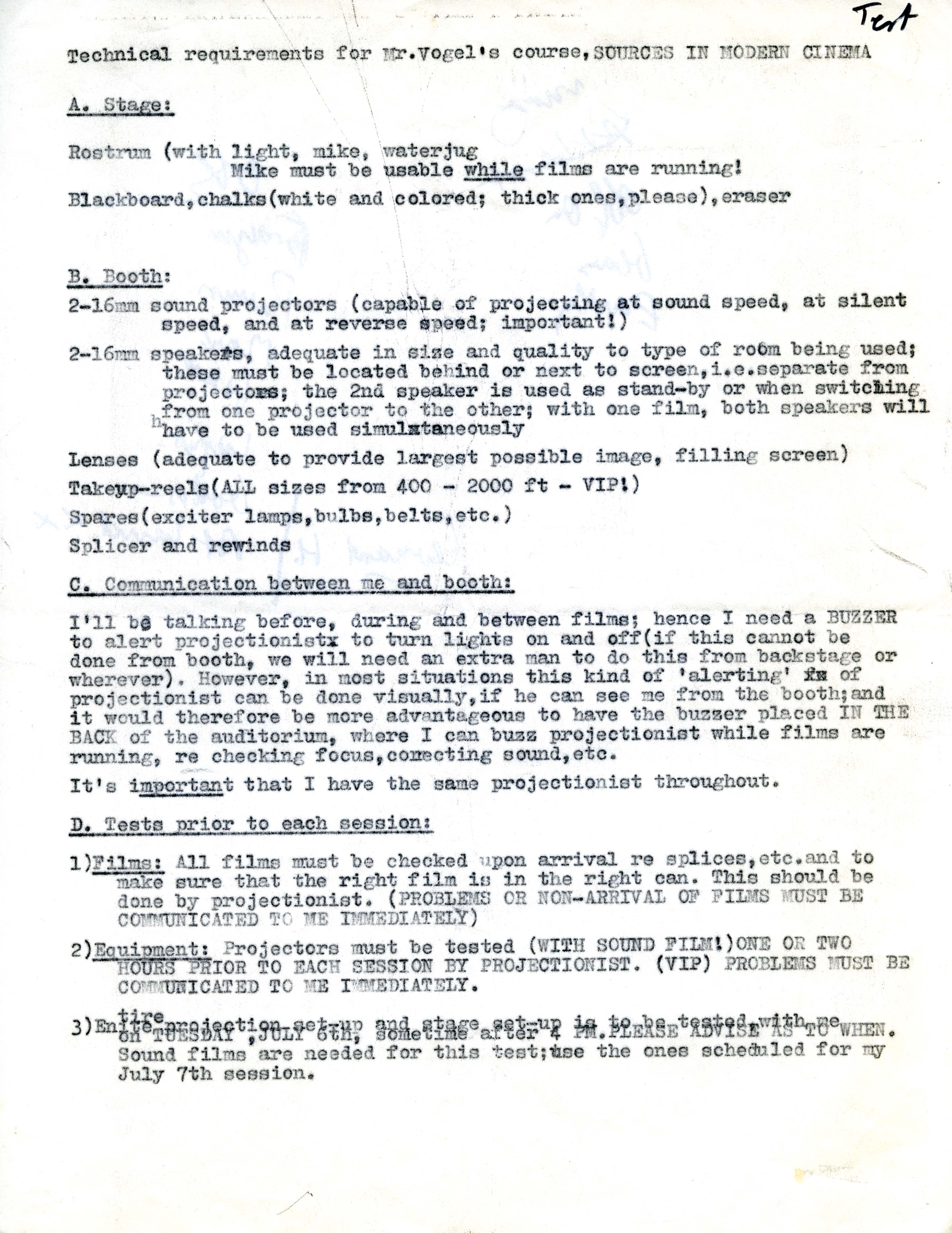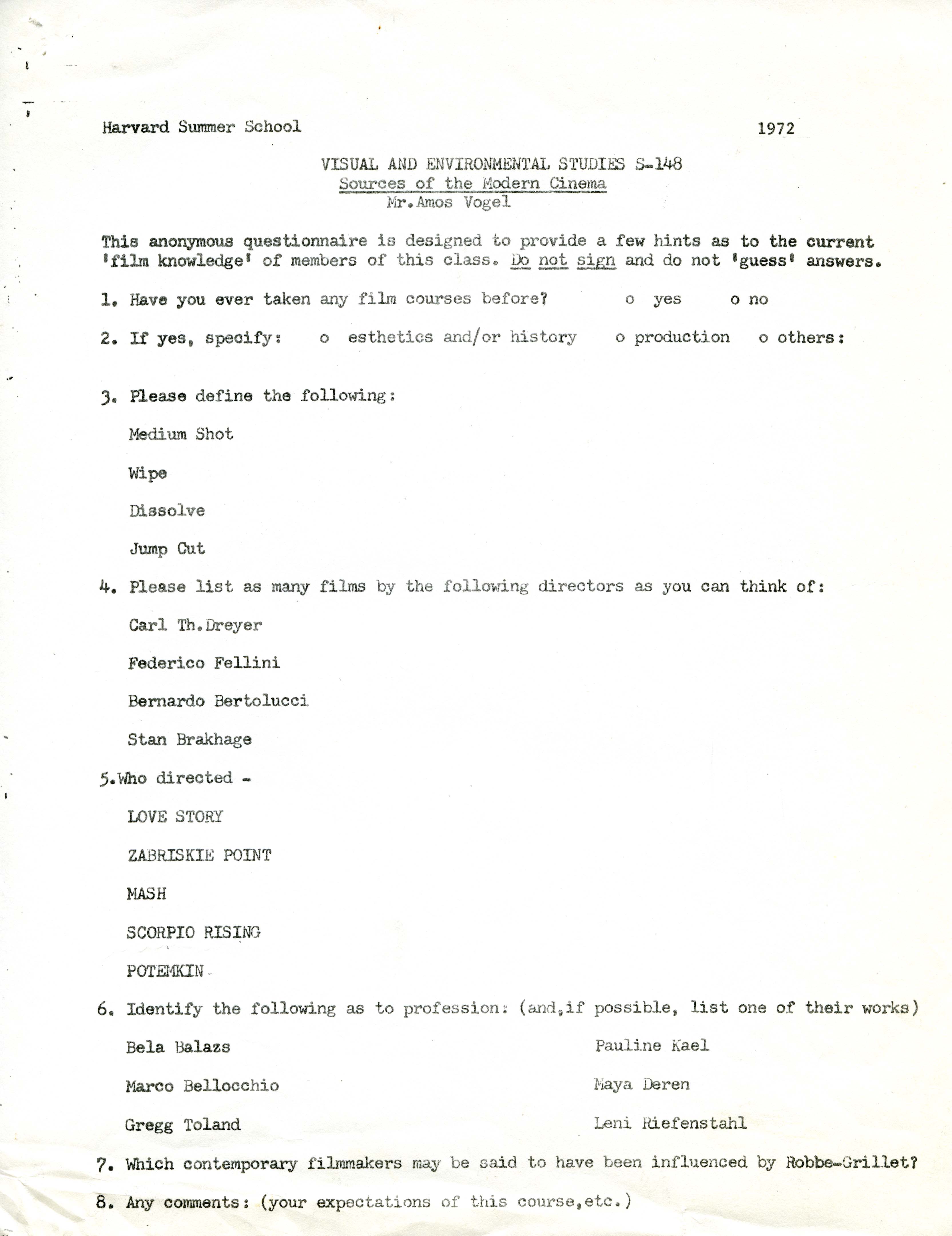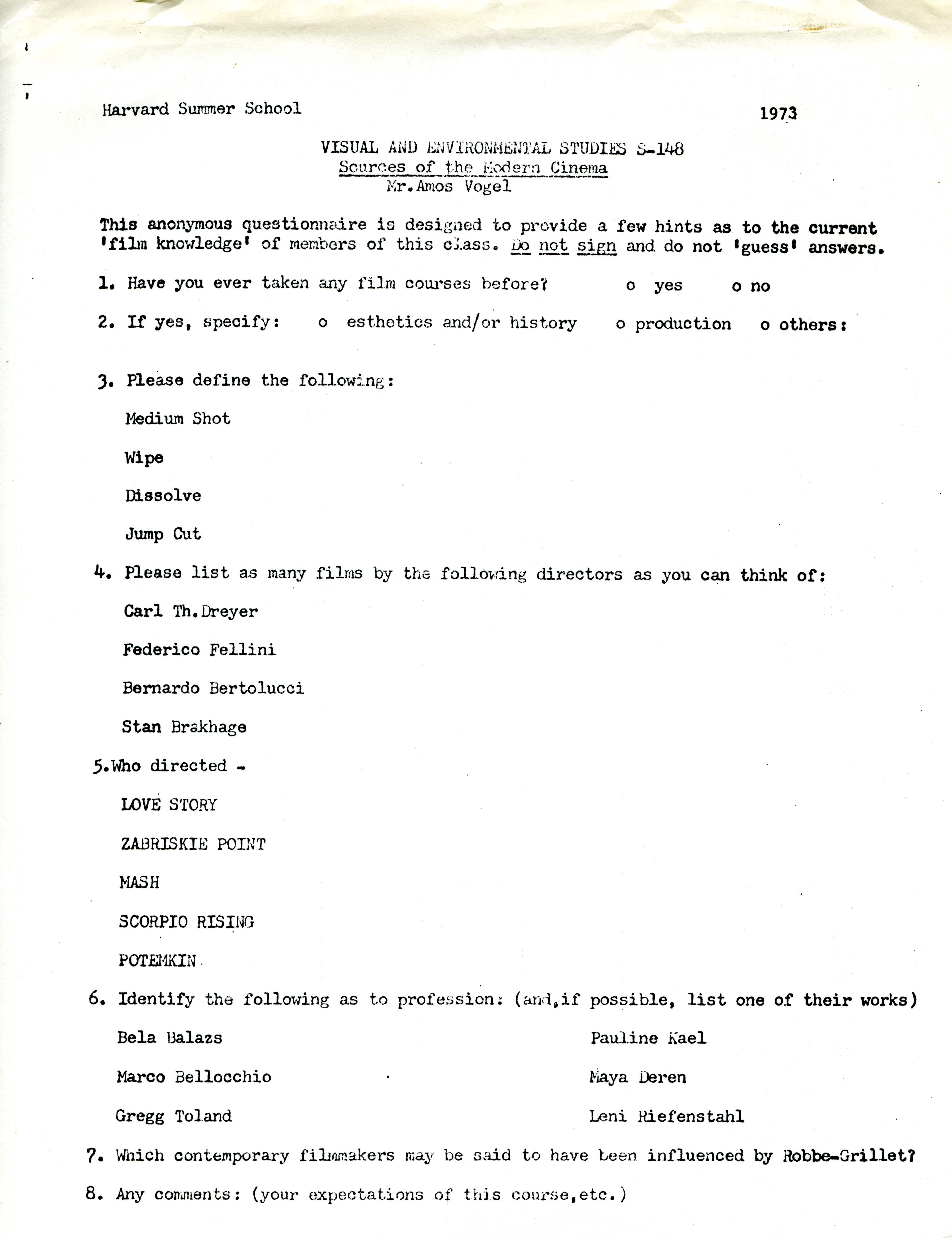 "Source of the Modern Cinema," Harvard course outline (1971)
