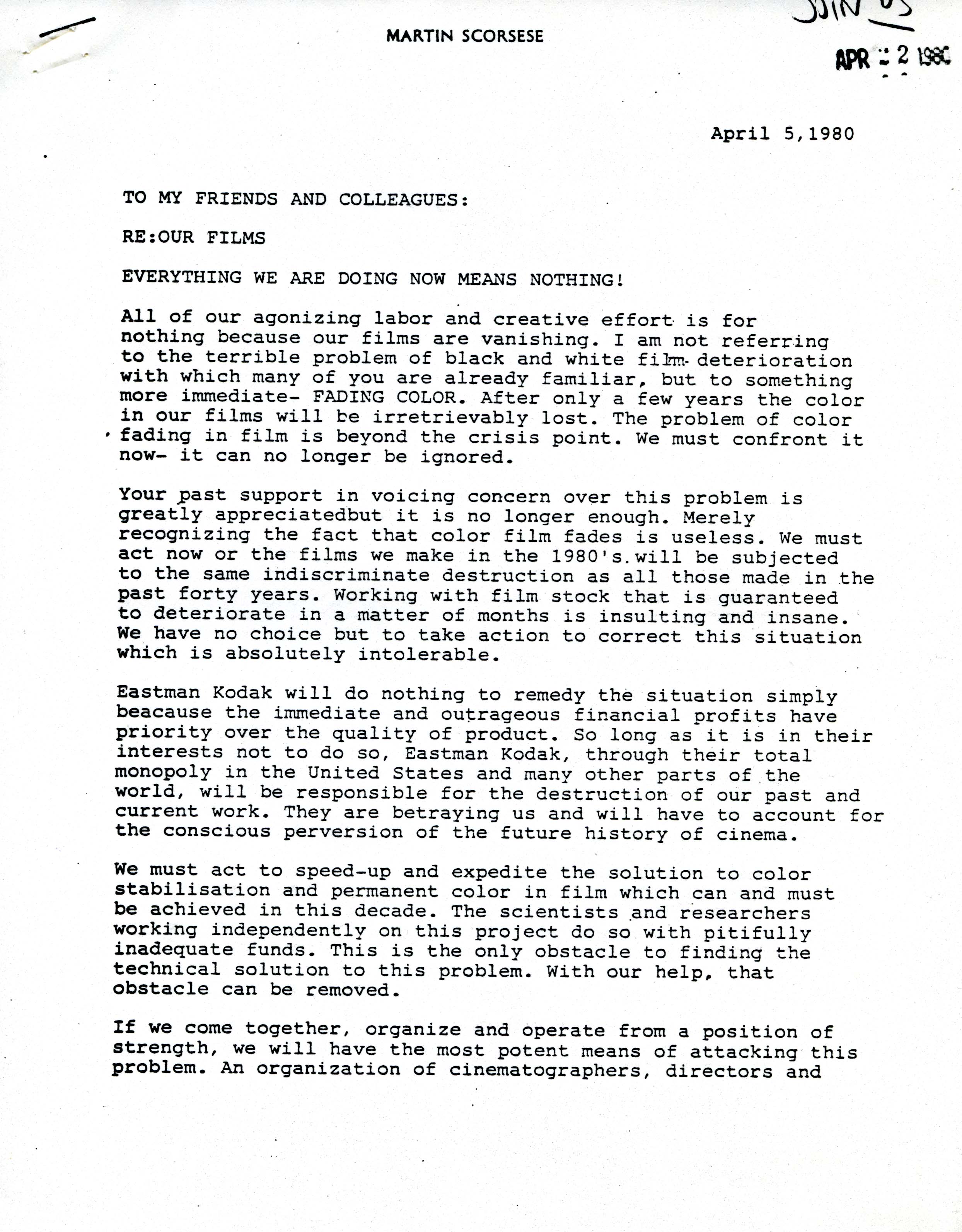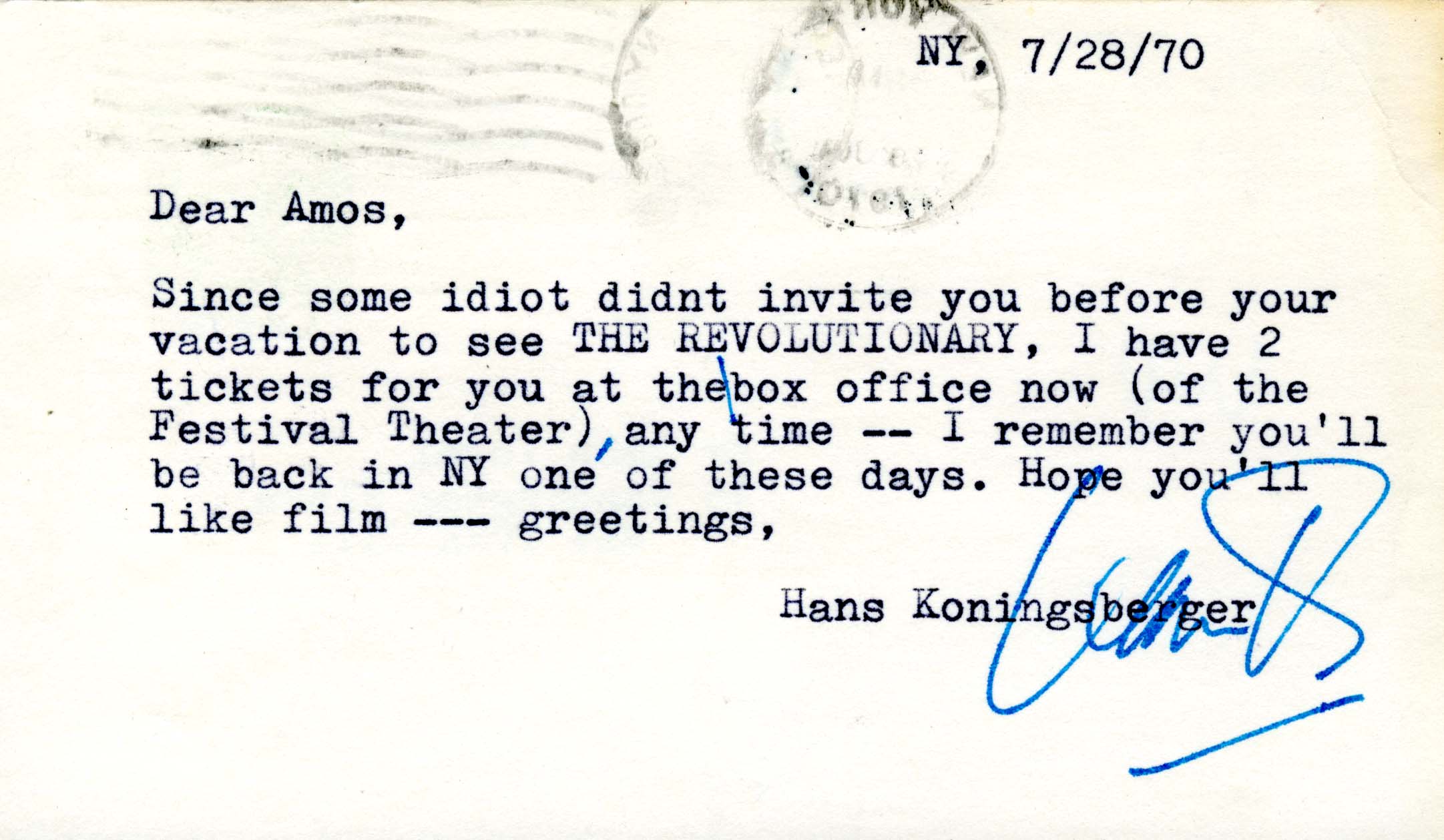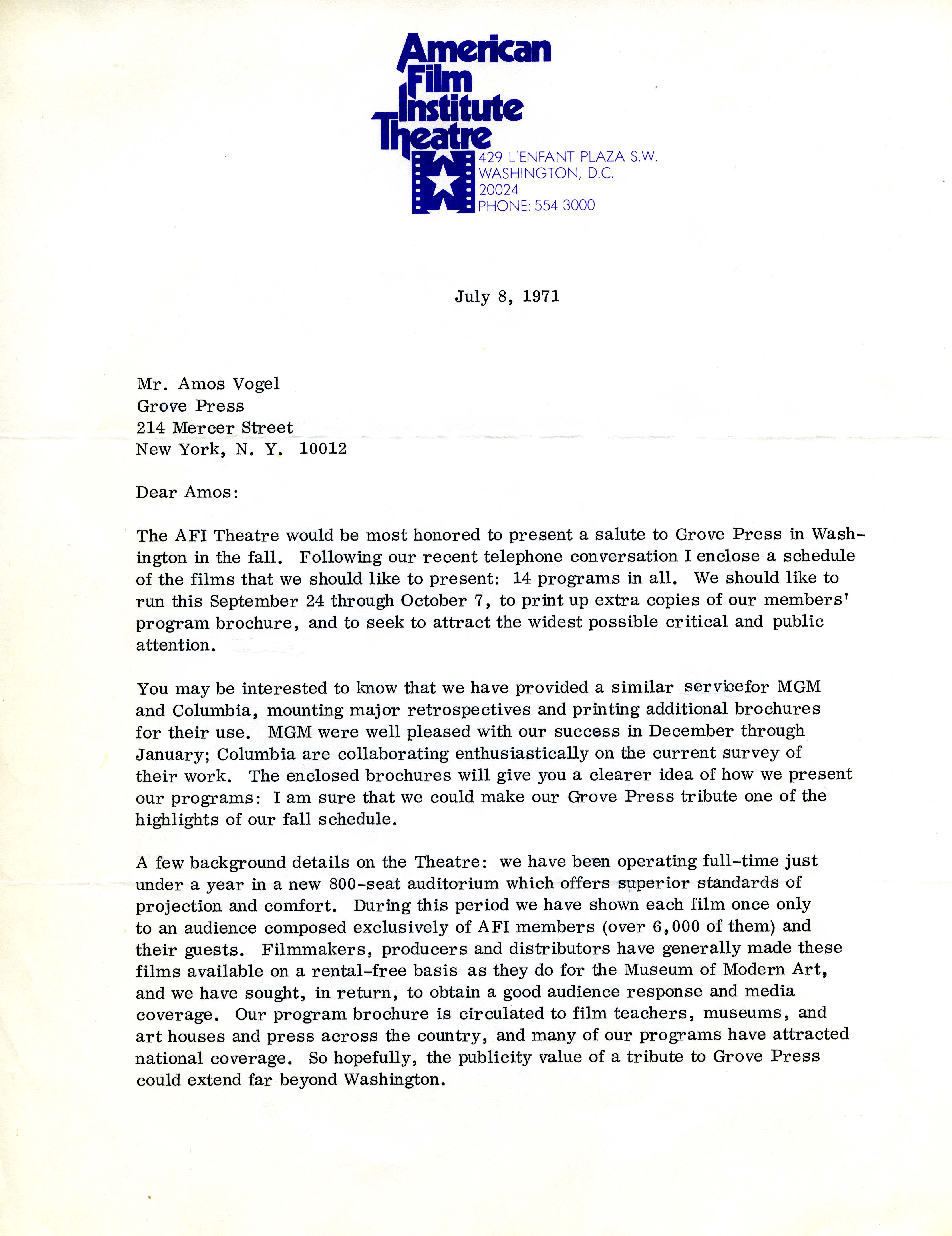 AFI Theatre letter, Grove Press tribute (July 8, 1971)