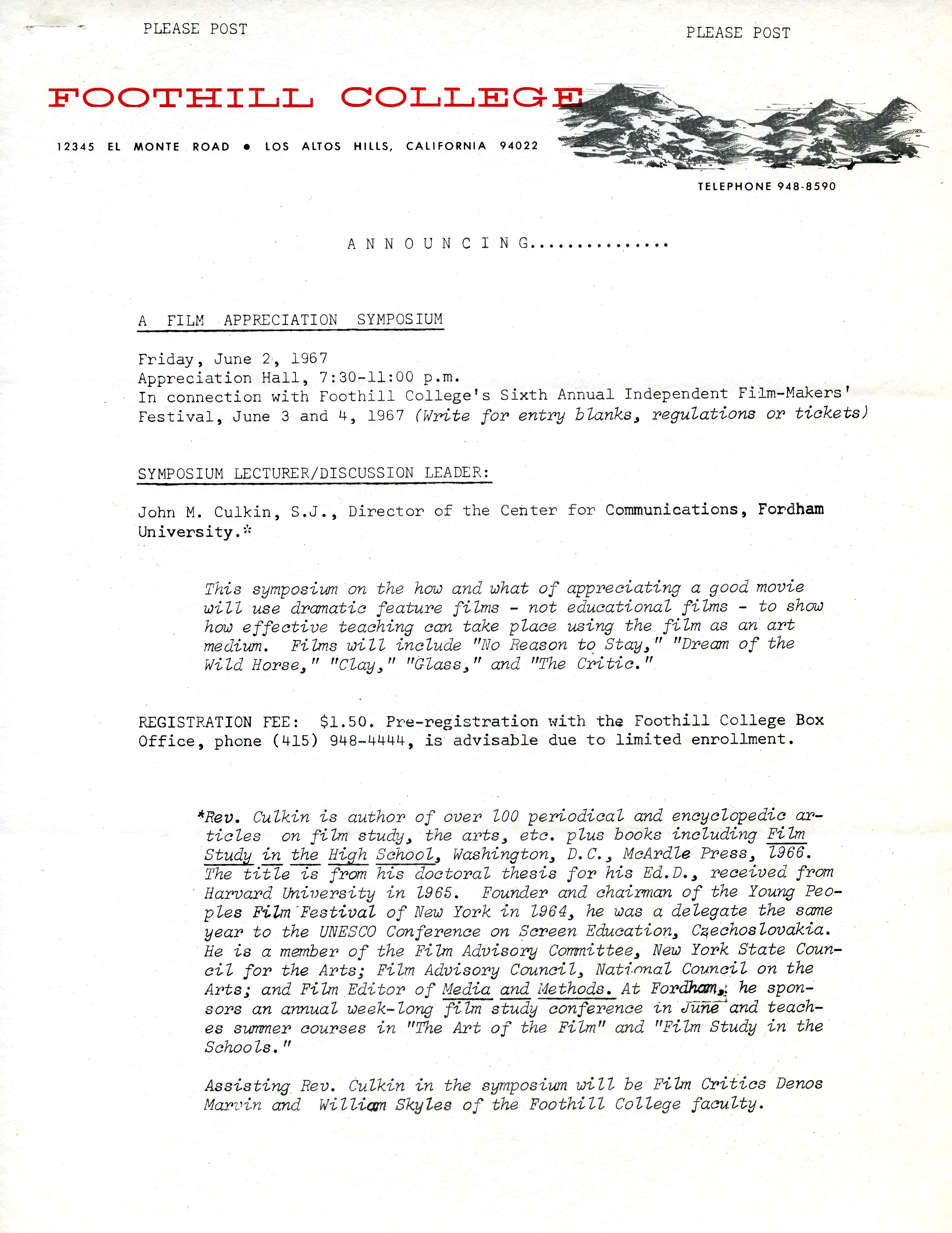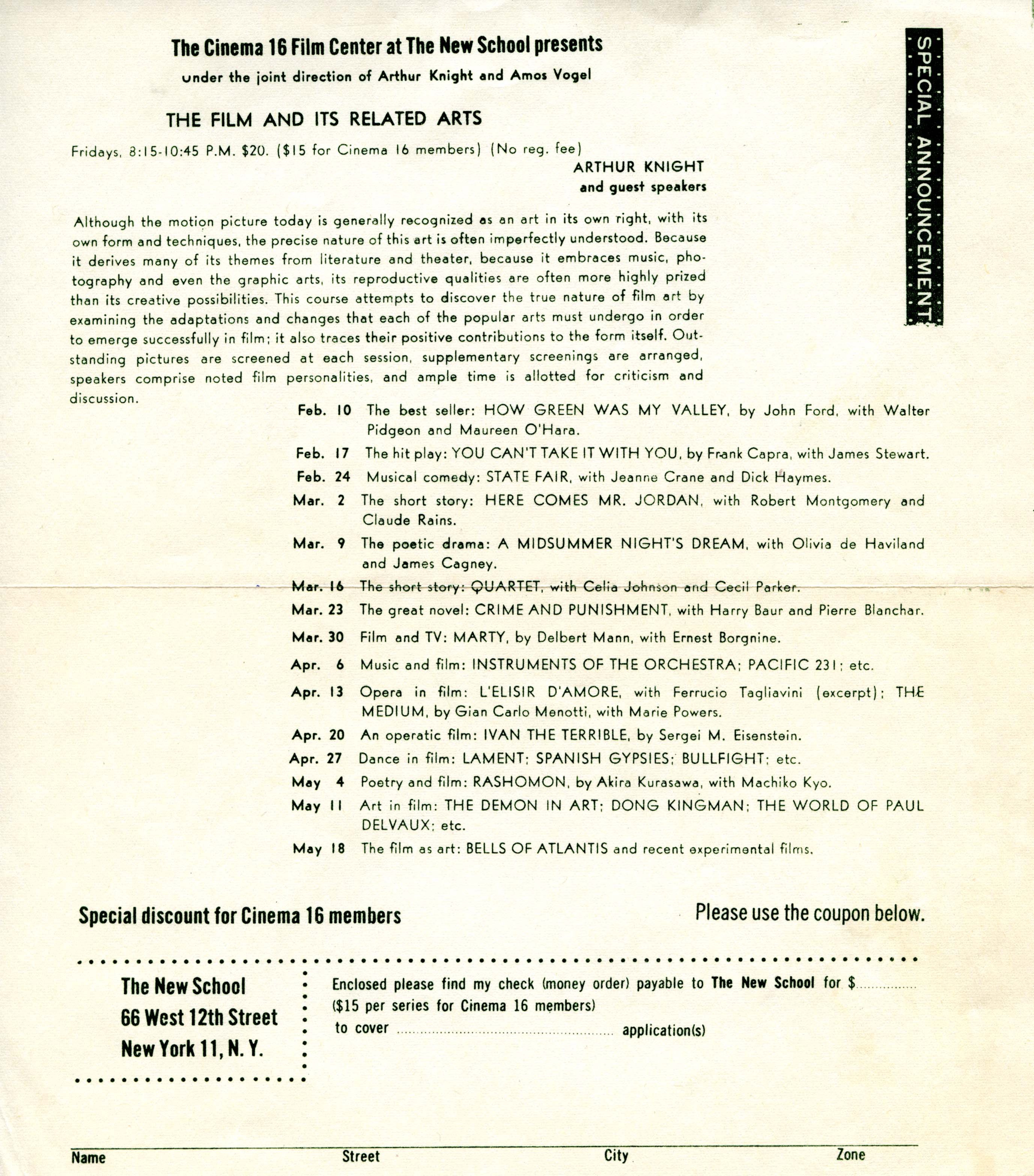 Cinema 16 Film Center flyer, "The Film and Its Related Arts" (undated)