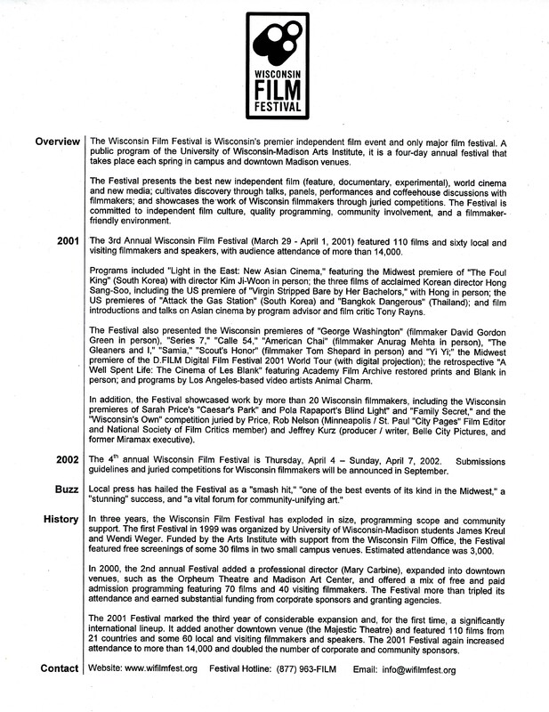 Wisconsin Film Festival overview sheet (2001)