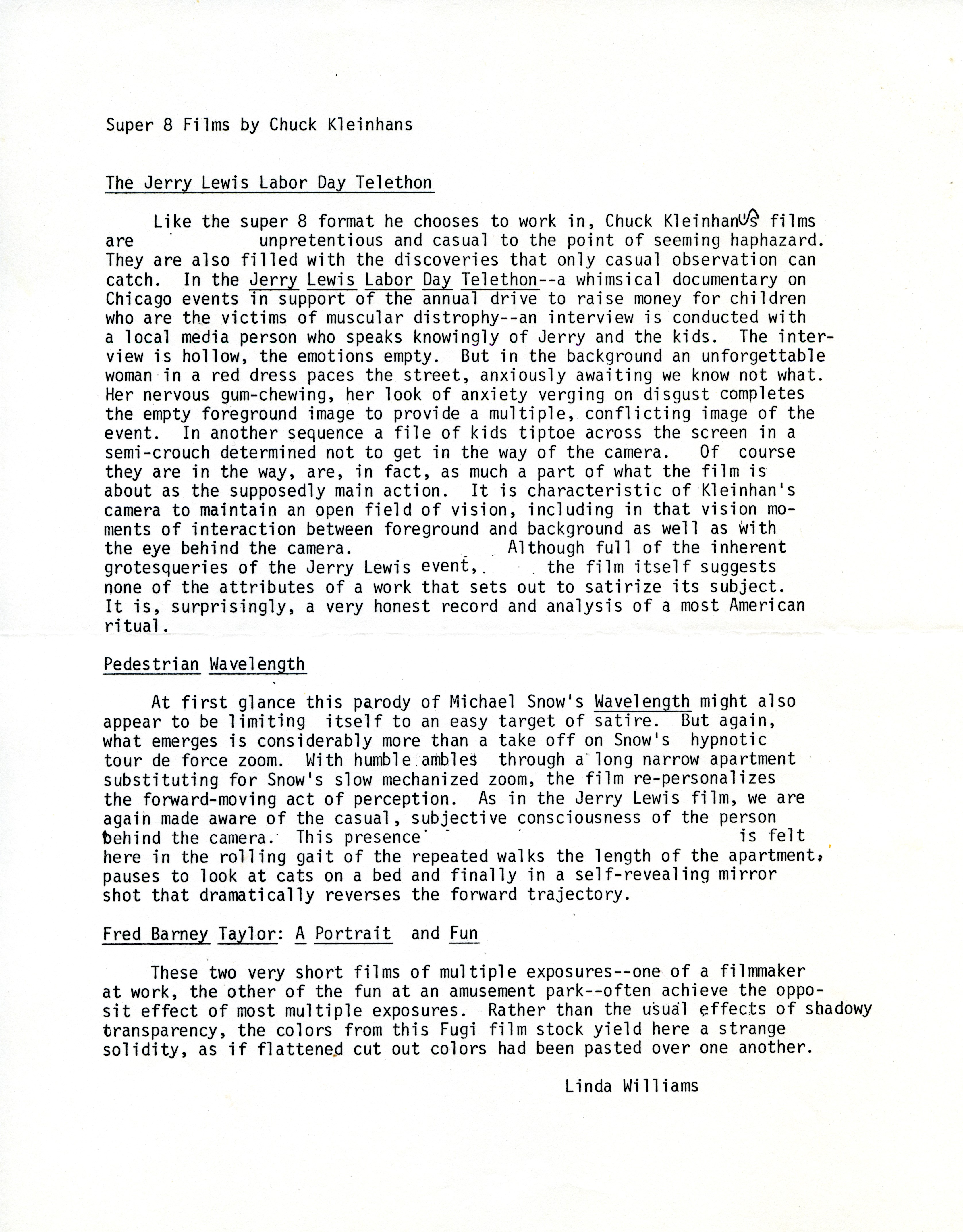 Kleinhans Super 8 Films notes, Linda Williams (undated)