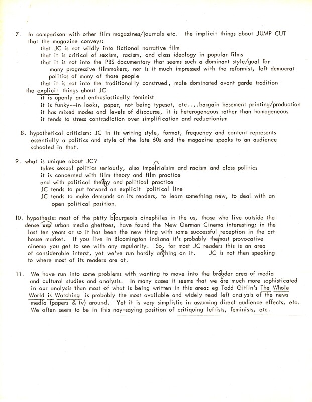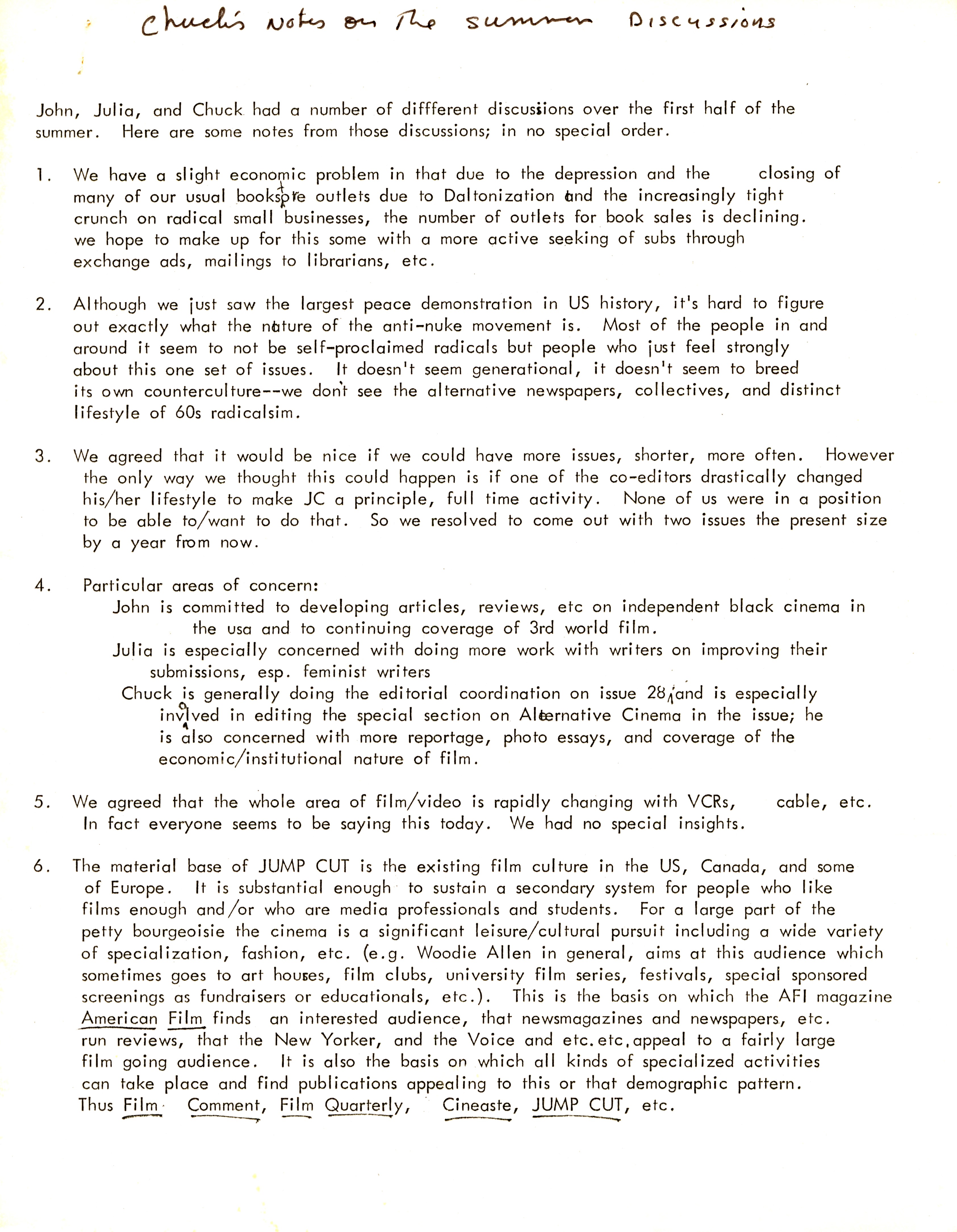 Jump Cut summer discussion, Kleinhans notes (circa 1982)