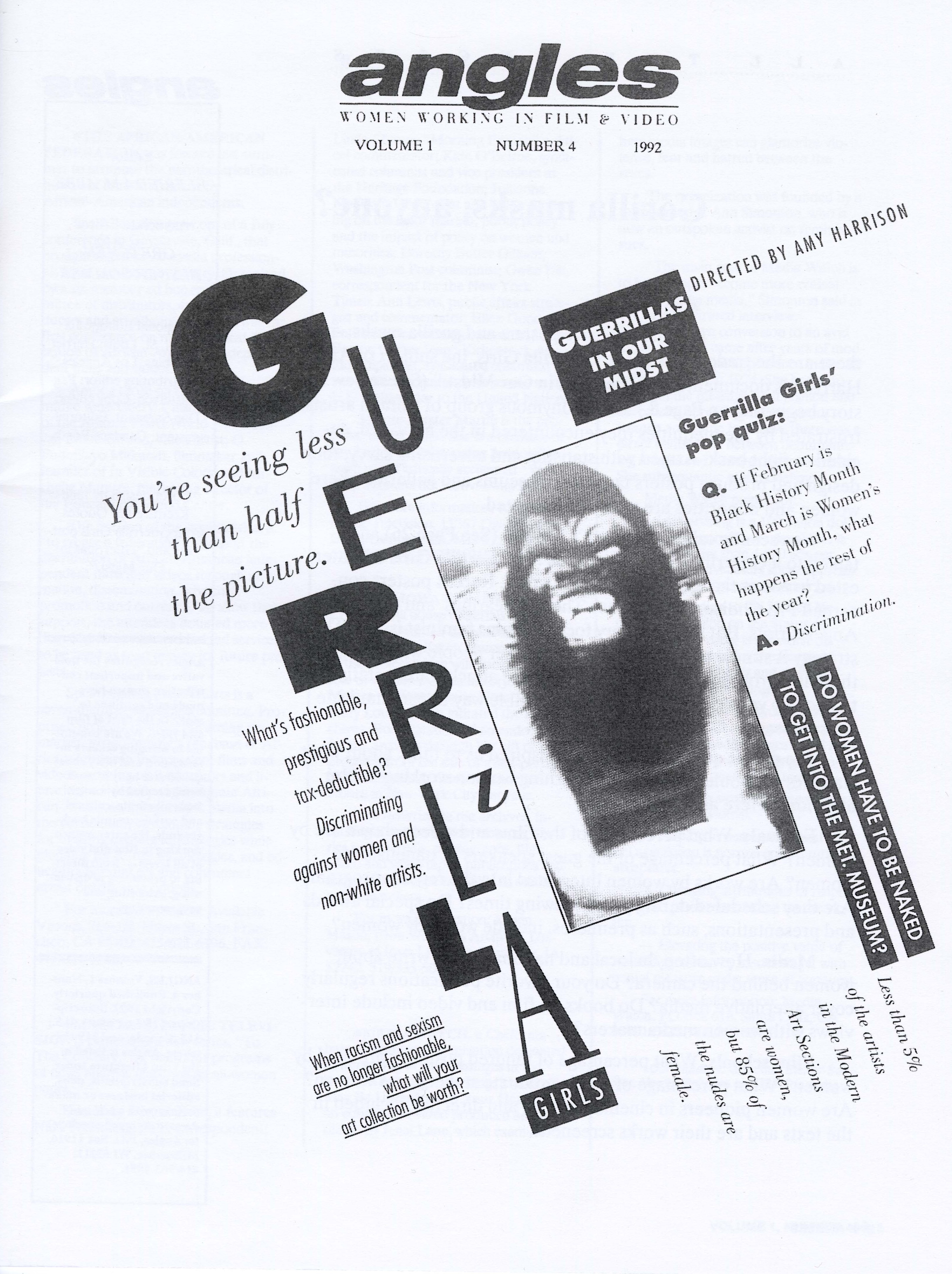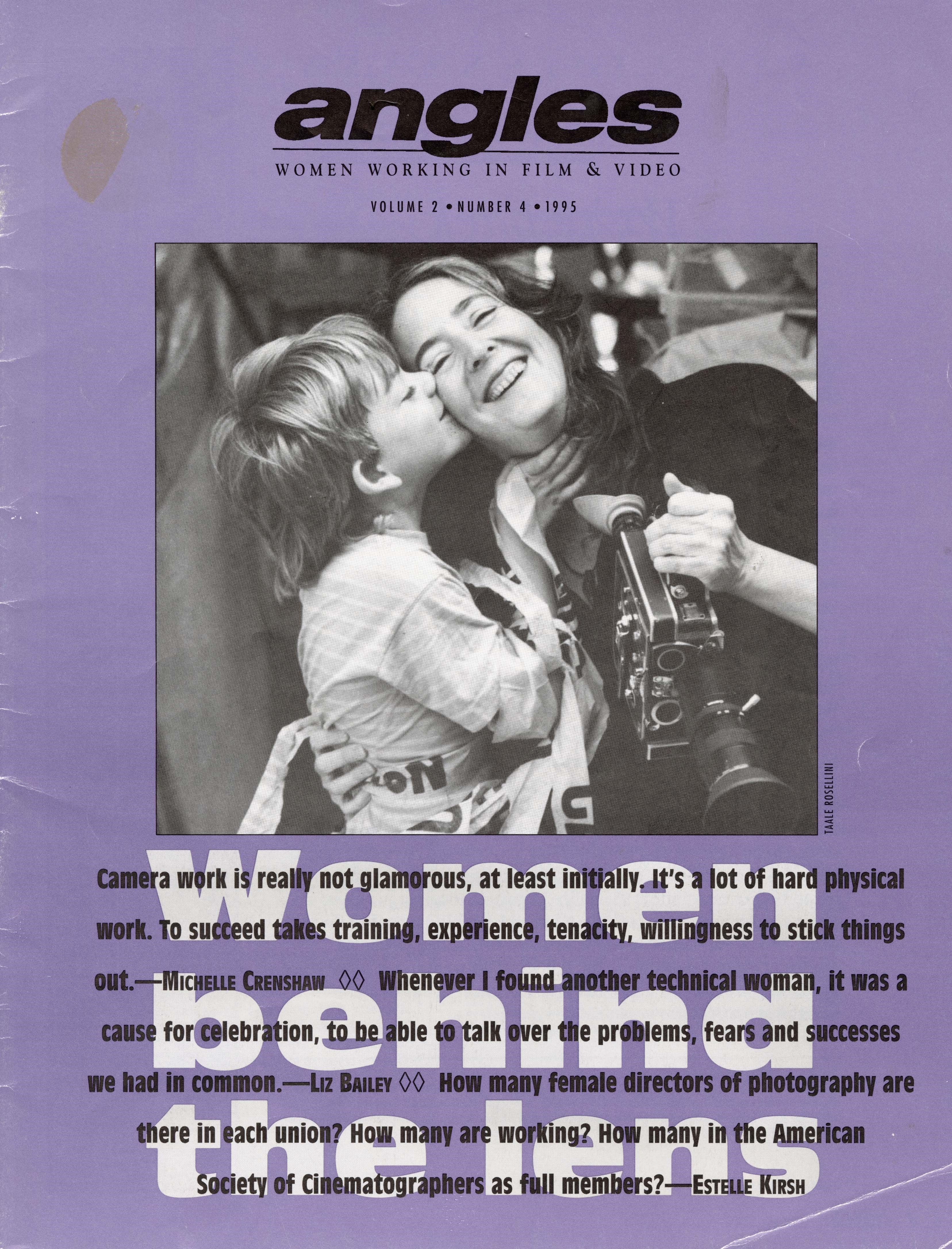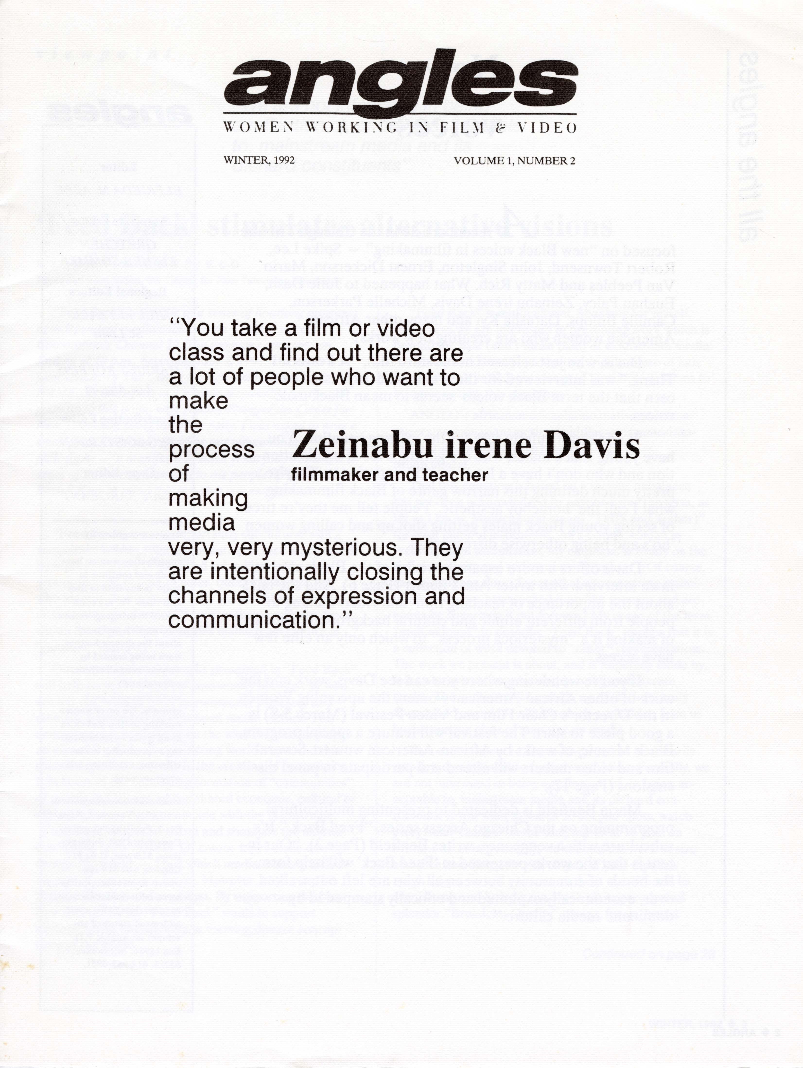 Released in the Fall of 1991, Angles was a magazine that highlighted the creative work being produced by women in the field of film and video. After working with her friend, Gretchen Elsner-Sommer, in the Chicago area promoting women focused festivals such as Women in the Director’s Chair, Elfrieda Abbe recognized a need for a magazine in the women in film community. Bringing together her skills as a journalist for the Wisconsin Sentinel, Elfrieda created Angles, a publication dedicated to sharing women’s work. With each edition, the magazine contained think pieces on film and video community, interviews with creators, festival notes, recommended books and films, correspondence with readers, and an “exchange” section, which acted as a classifieds section of the magazine with the goal of connecting people to support the creation of feminist media.