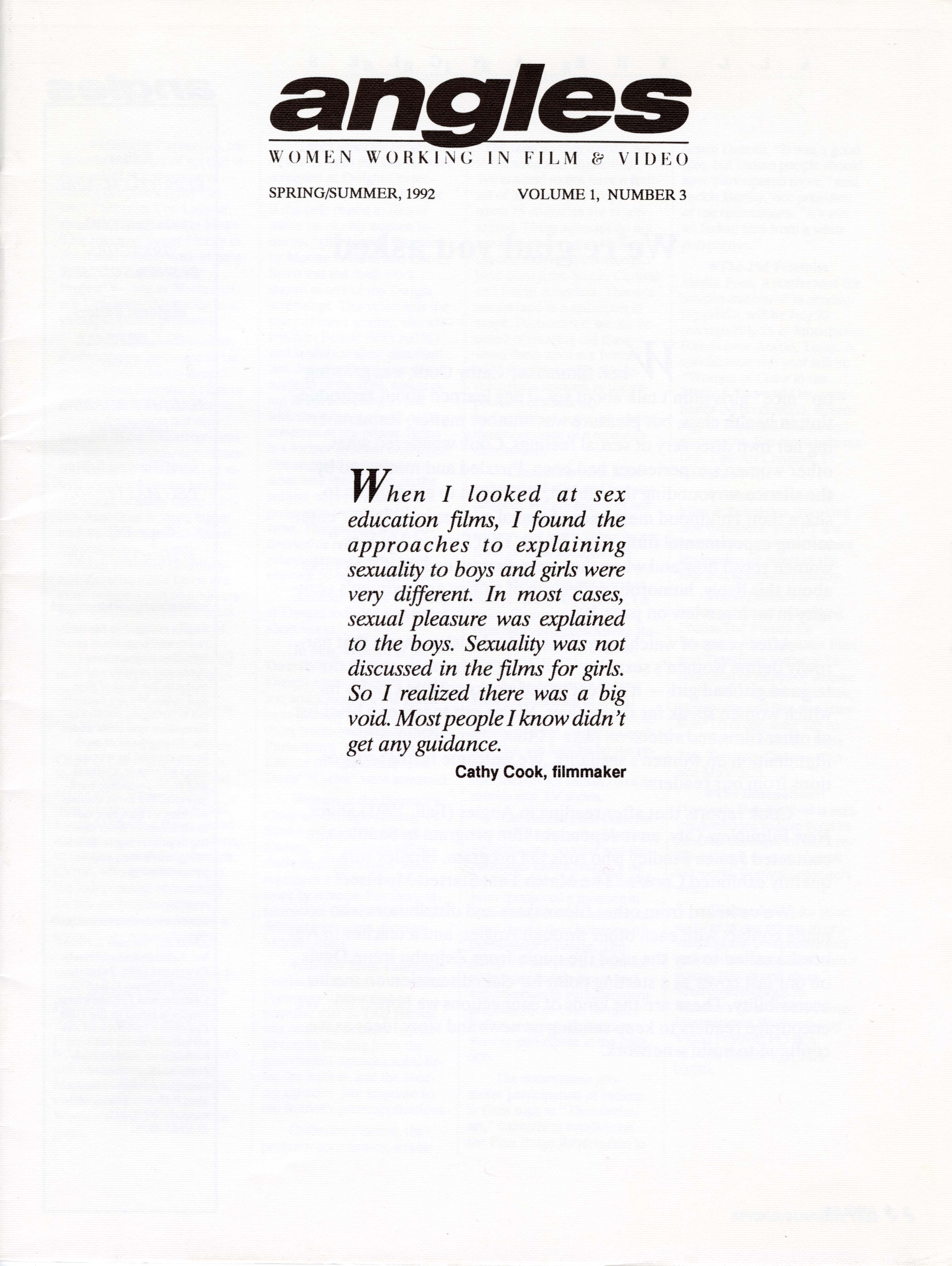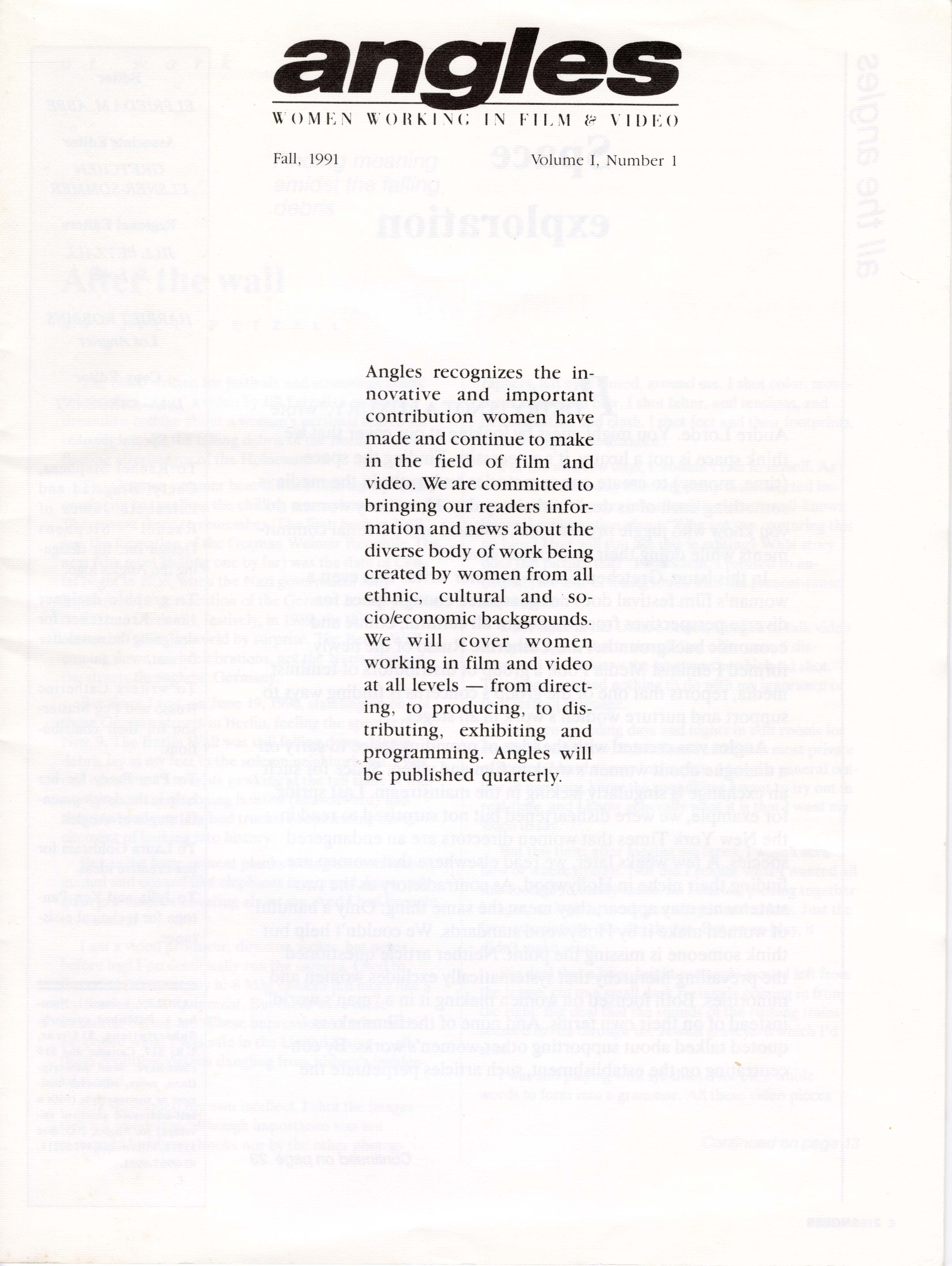 There are 13 issues of Angles, running from 1991 to 2003. The magazine worked to highlight the work of all kinds of women, noting their commitment to sharing news about “the diverse body of work created by women from all ethnic, cultural, racial, and socio/economic backgrounds.” The magazine was created by women for women to foster community and support for those passionate about film and video.