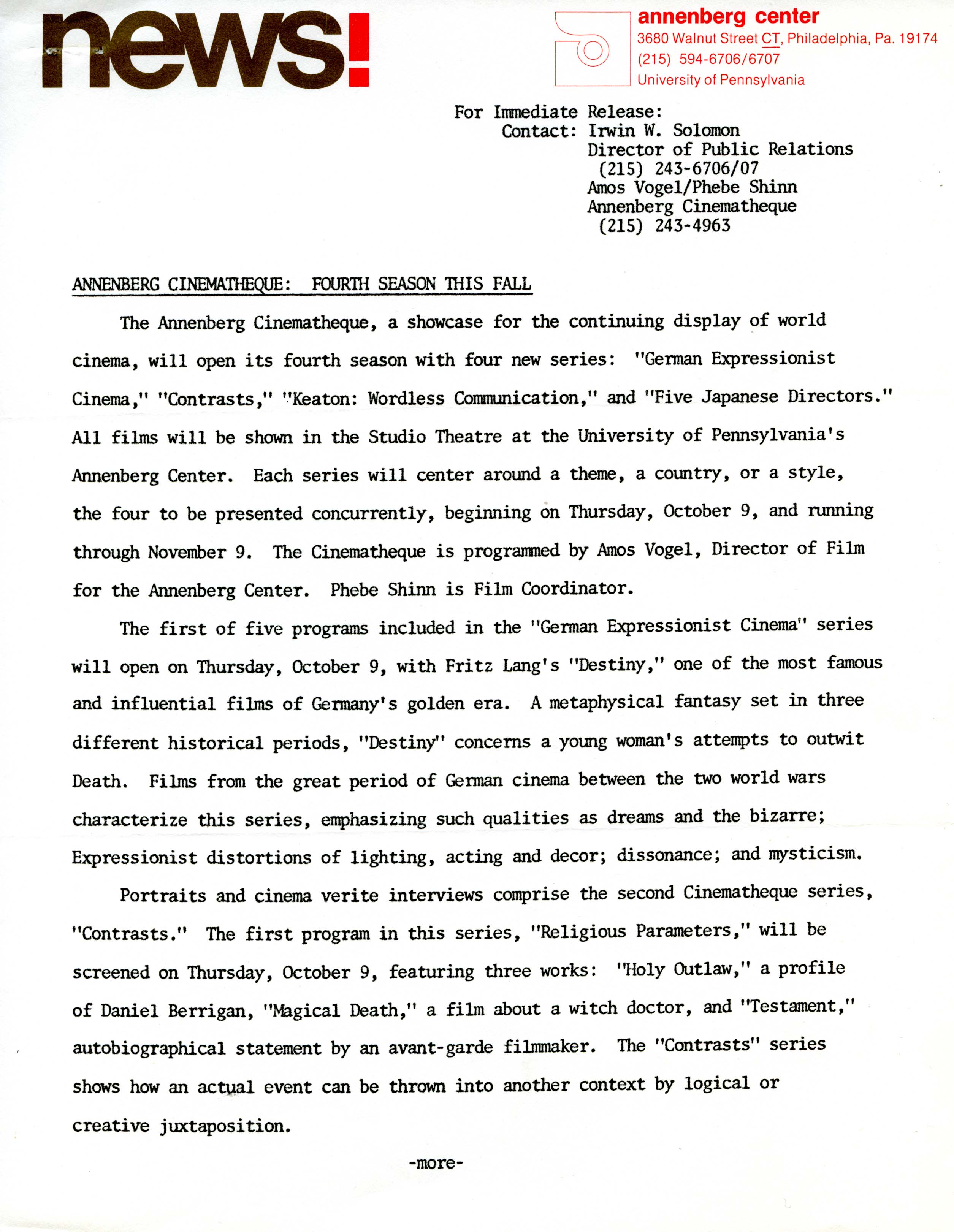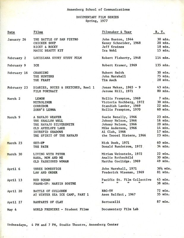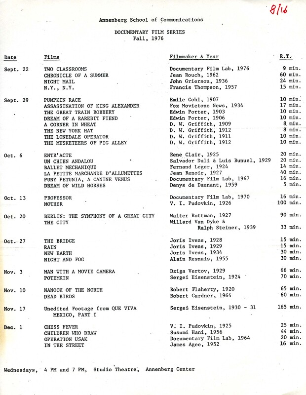 Vogel was the director of film and a faculty member at the University of Pennsylvania's Annenberg School of Communications from the early 1970s to the early 1990s. He founded the Annenberg Cinematheque on campus, often programming series based on specific themes and genres. The documents here exemplify Vogel's approach to documentary film programming, in addition to some general Cinematheque schedules.