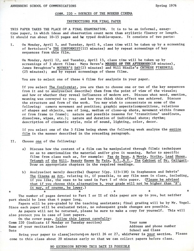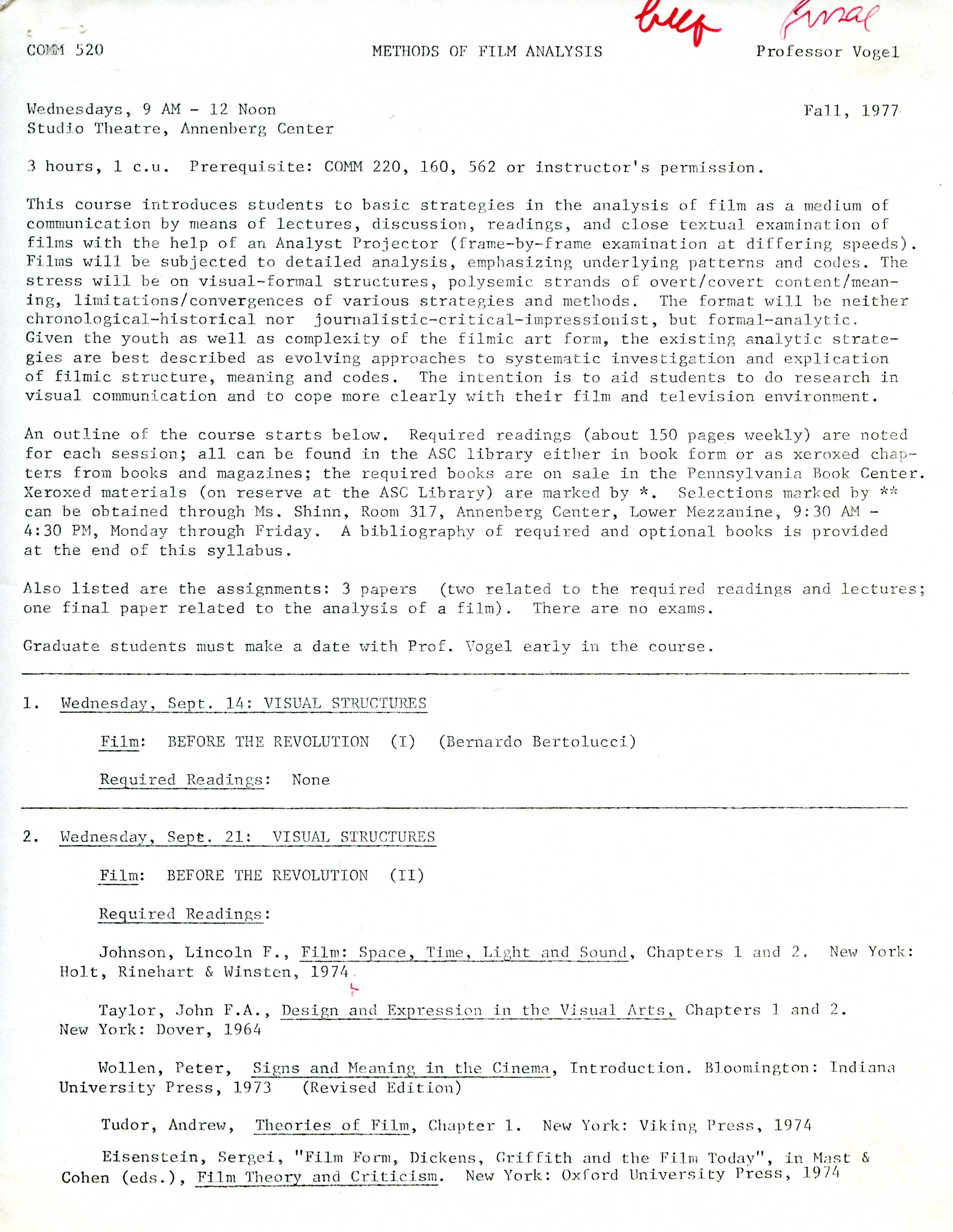 Vogel also taught courses at the Annenberg School, including "Sources of the Modern Cinema" and "Methods of Film Analysis." Teaching materials from his collection show how he envisioned a "formal-analytic" approach to film education, arranging course content based on analytical methods rather than historical chronology.