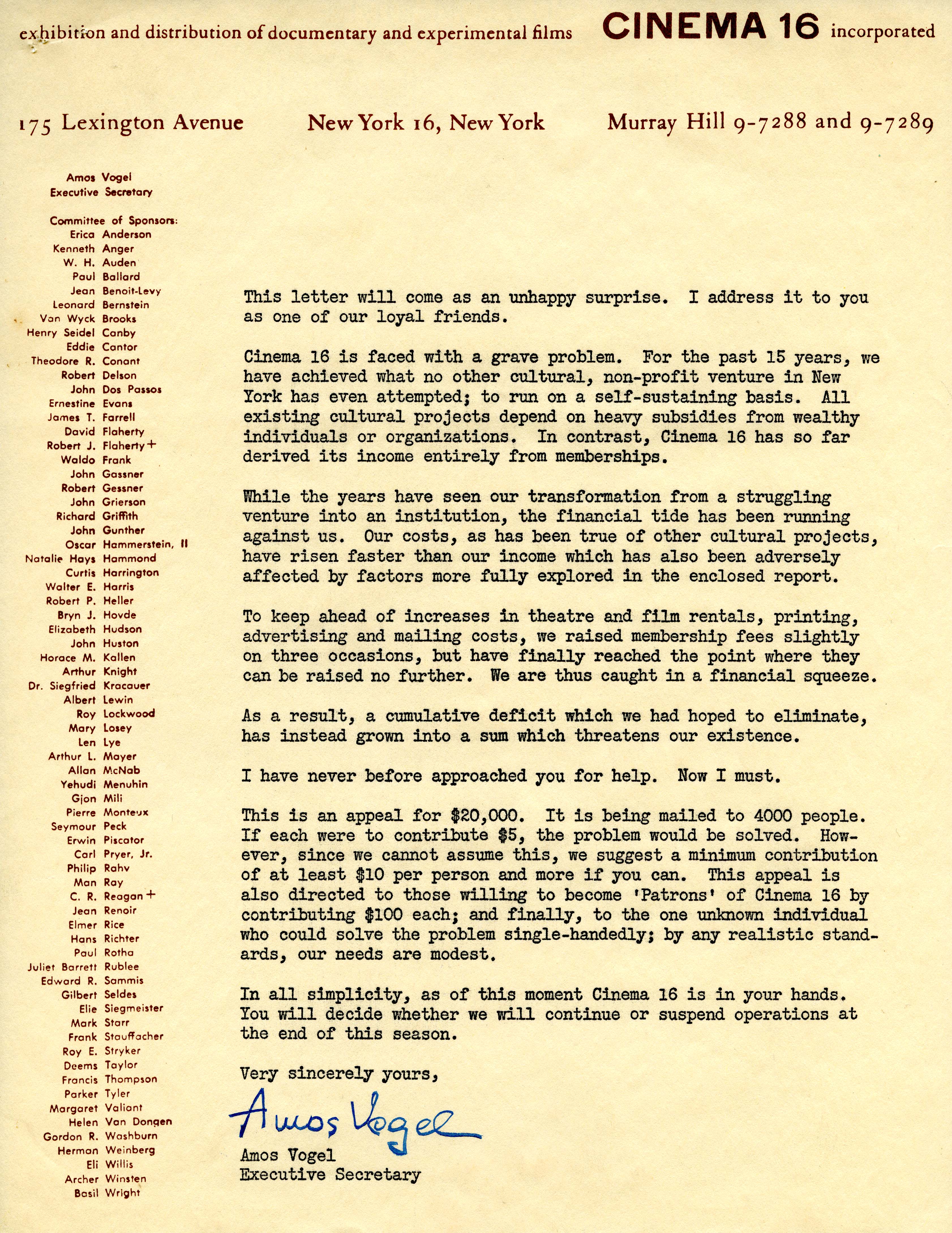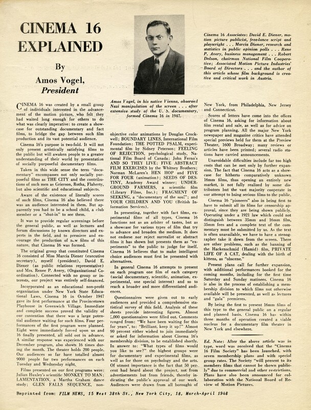 Amos Vogel started Cinema 16 alongside his wife Marcia Vogel in New York City in 1947, and the non-profit film society was an institution of the city’s film culture from its establishment until its end, due to financial constraints, in 1963. The program for each month was typically shown four or five times, and screenings took place at the 1600-seat auditorium at the Central High School of Needle Trades (now the High School of Fashion Industries) and at other Manhattan venues like the Paris Theatre and the Beekman Theatre. With 7000 members at one point, Cinema 16 was the largest film society in the U.S.