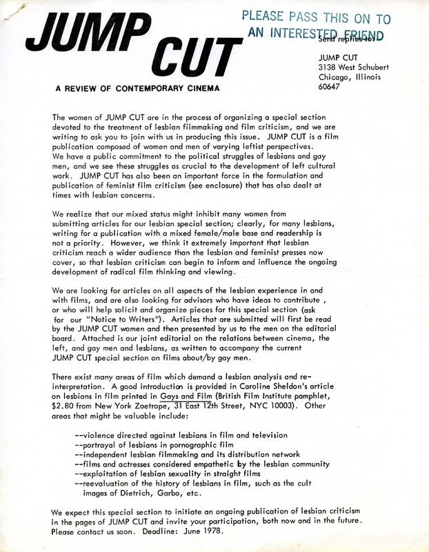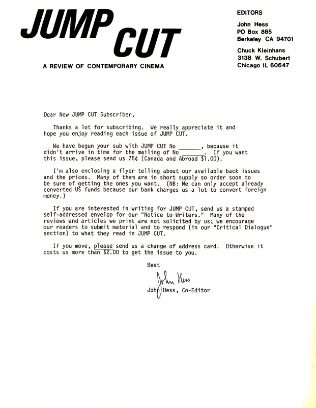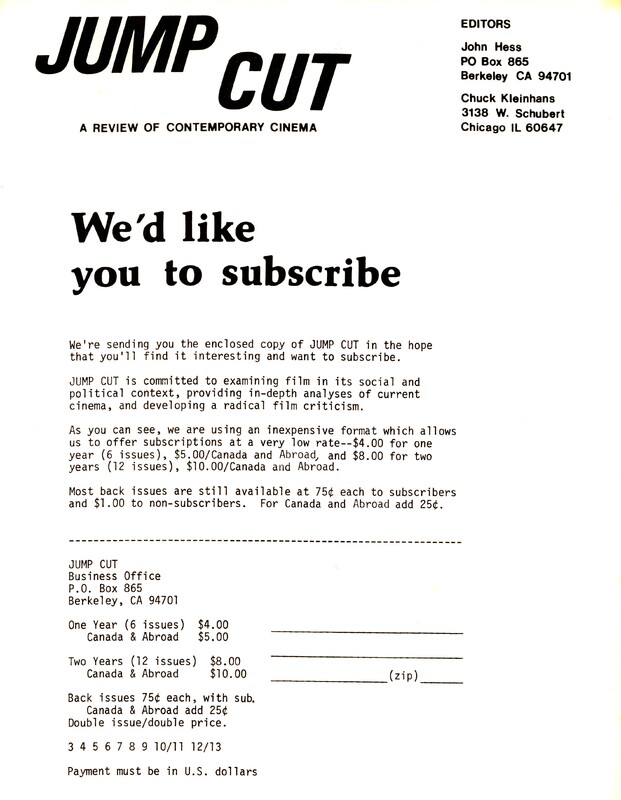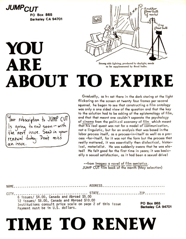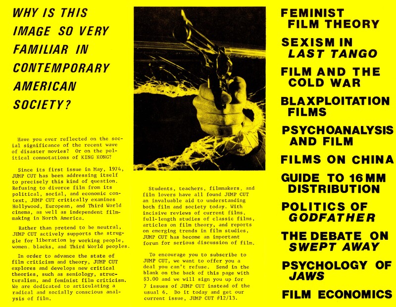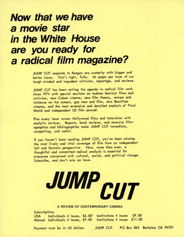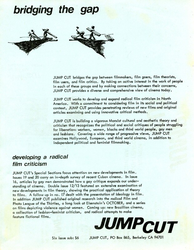 The flyers, letters, and calls for paper below show the playful style employed in promoting and publishing Jump Cut, while also demonstrating the journal's strong rhetorical stance that was established from the beginning.