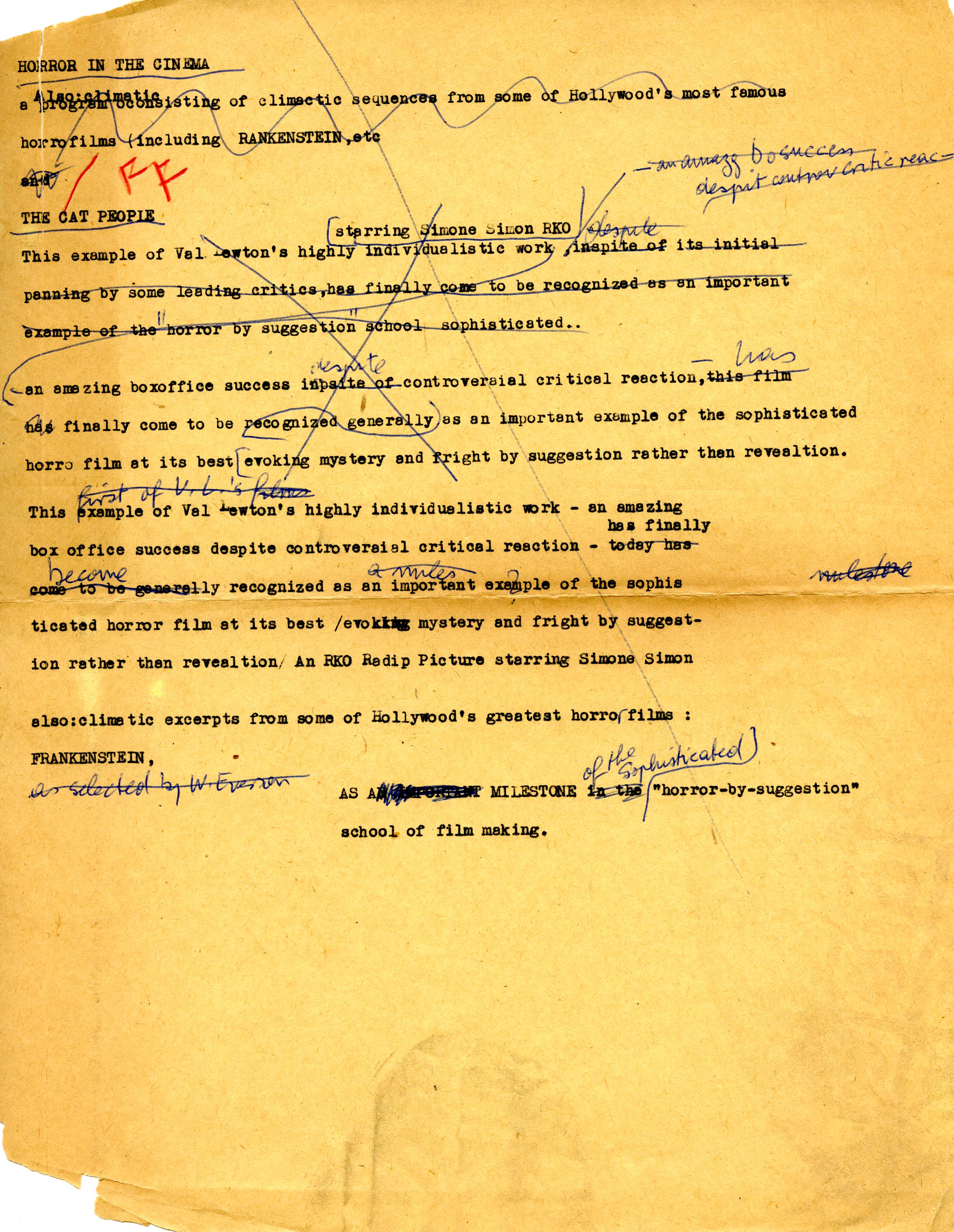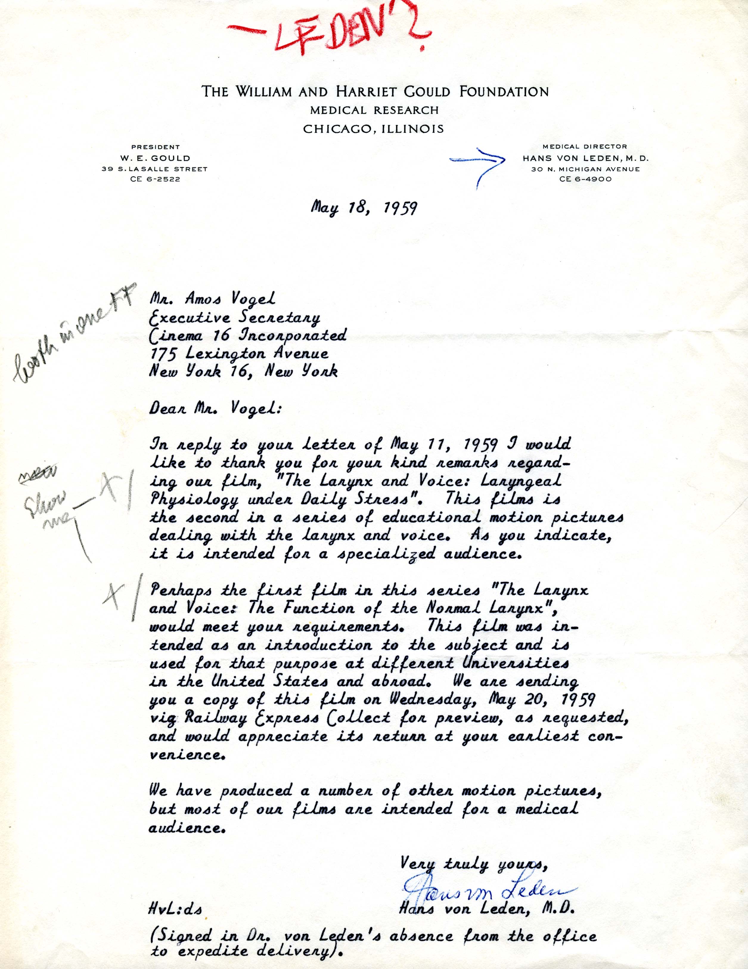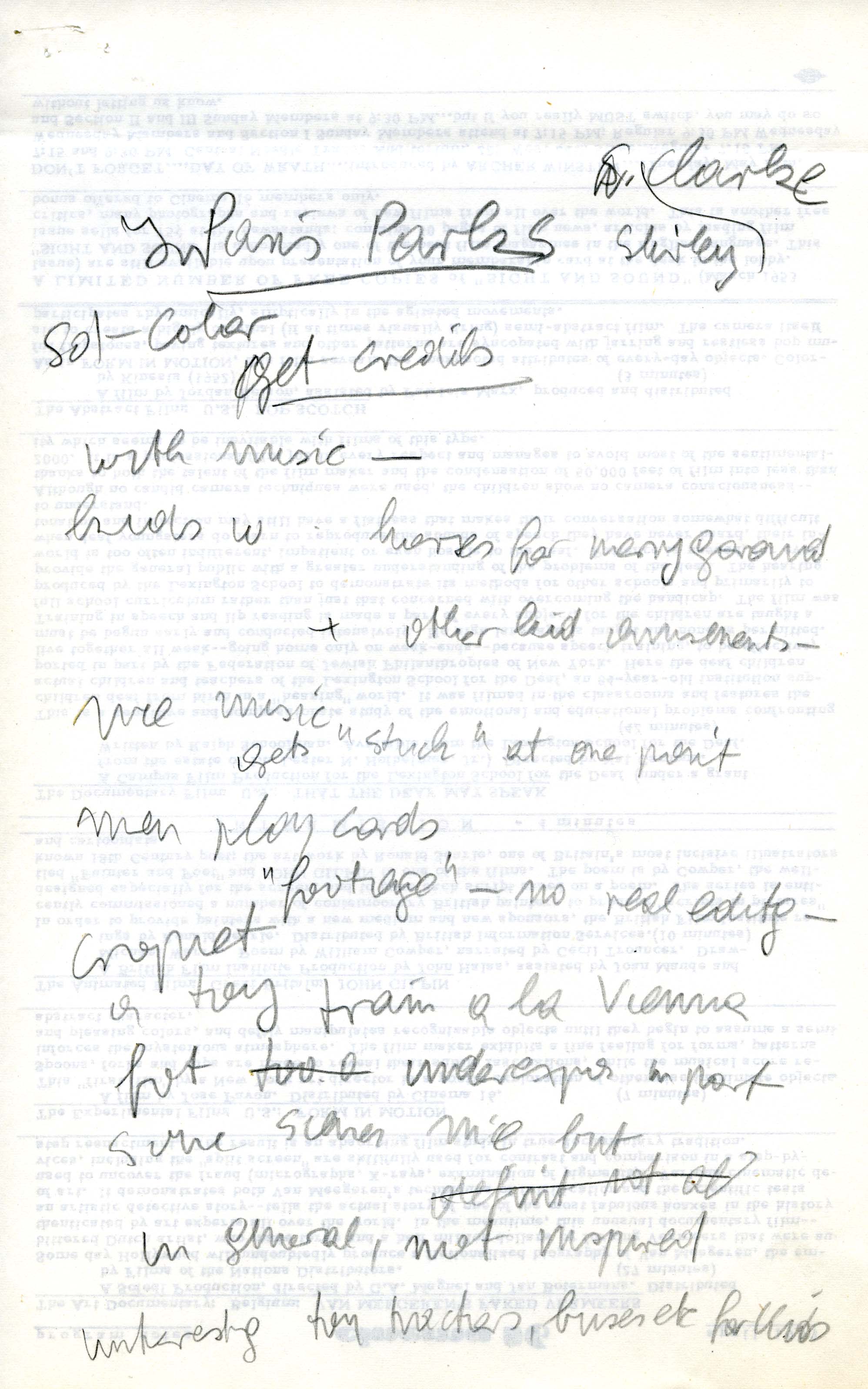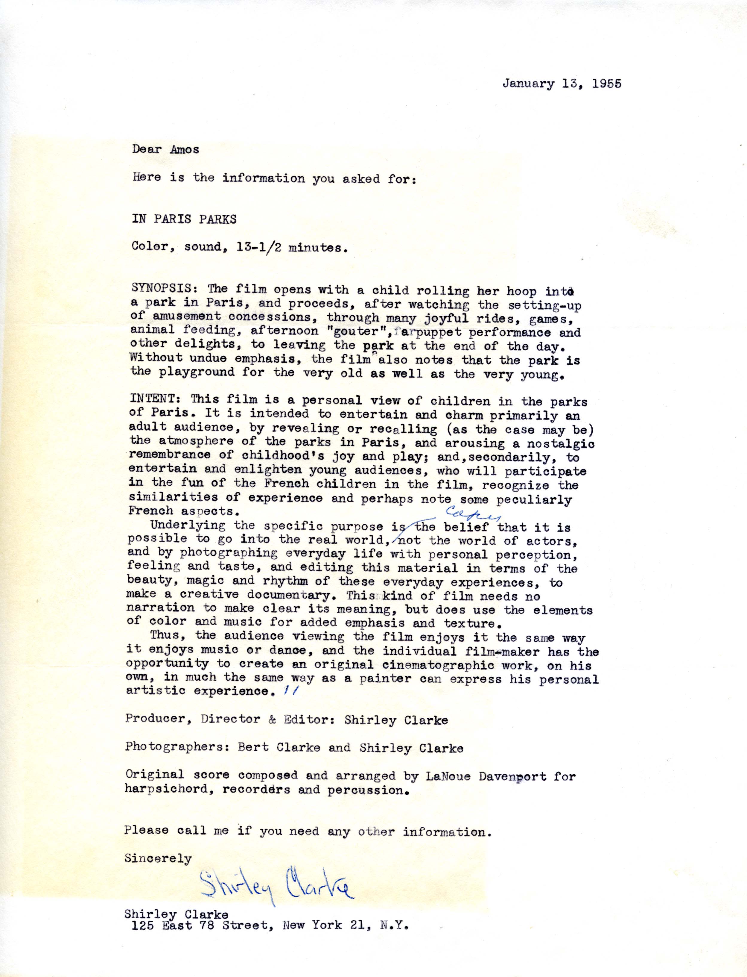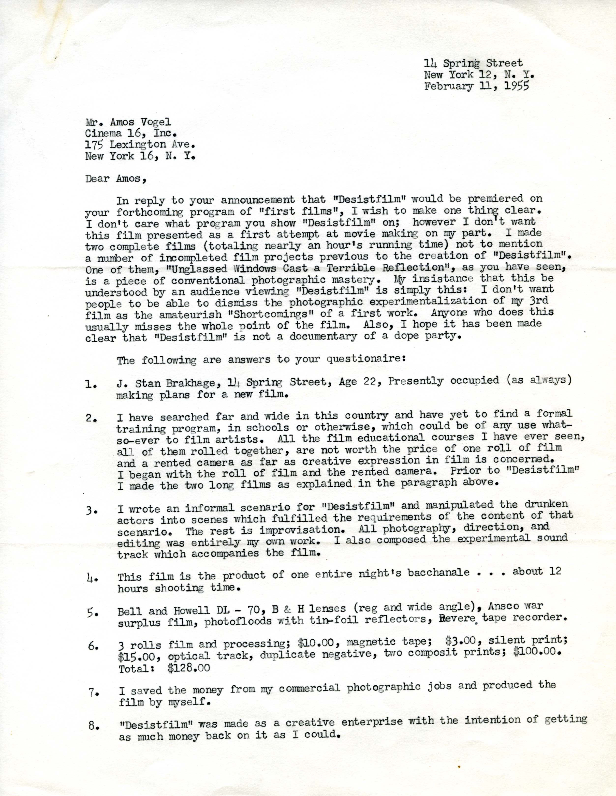 Amos Vogel viewed thousands of films through the process of programming for Cinema 16, and he took notes about their quality and potential appeal to audiences. The WCFTR's Vogel collection contains thousands of his screening notes, with a few examples provided here. Alongside screening notes, Vogel often filed correspondence with filmmakers such as Shirley Clarke and Stan Brakhage, with questions about screening the films at Cinema 16 or how the films might be framed for audiences through descriptions that would convince audiences to attend screenings while also sticking close to the filmmakers' vision.