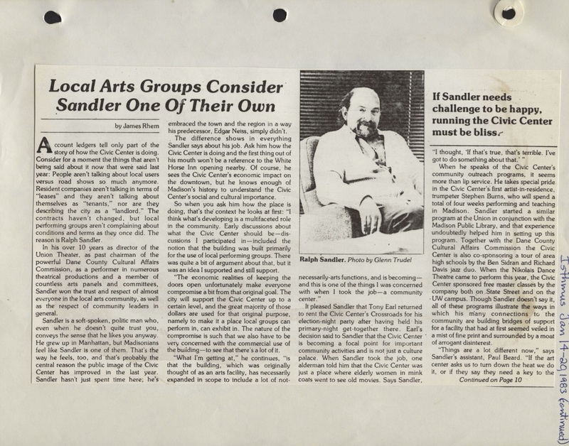 Sandler's Approval from Art Groups (Isthmus 1983)